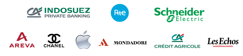 BANQUE POSTALE, ANFA, AREVA, CHANEL, APPLE, MONDADORI, ATOS ORIGIN, EDF, Groupe LES ECHOS, AXA, MERCK, ALCON, ALLIANZ, GROUPAMA.